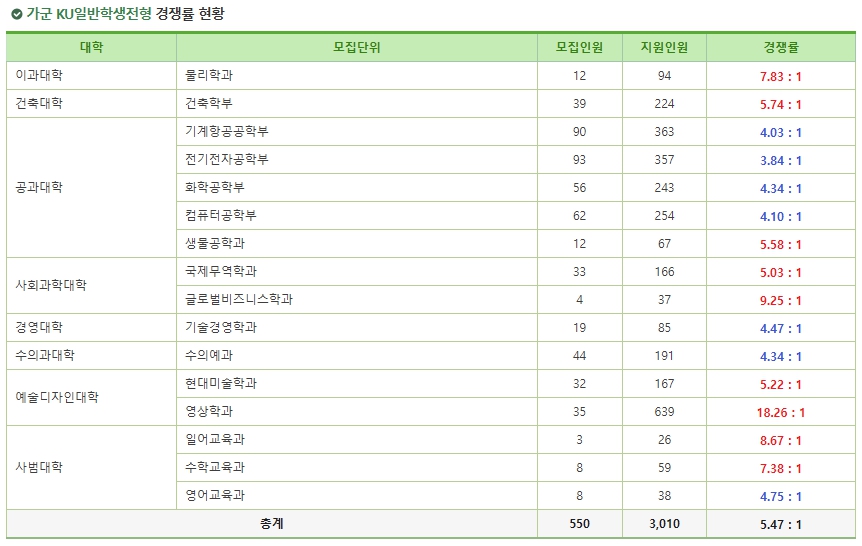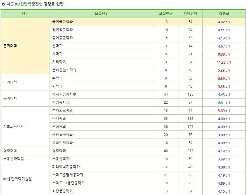 일단 건국대 경쟁률과 입시결과를 알아보려고 하는데 다른 것보다 평균적으로 지원하는 일반전형에 대해서 알아보려고 합니다.
