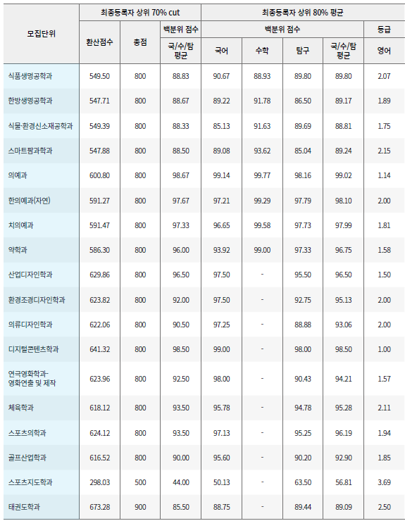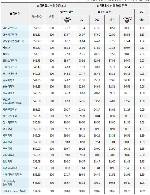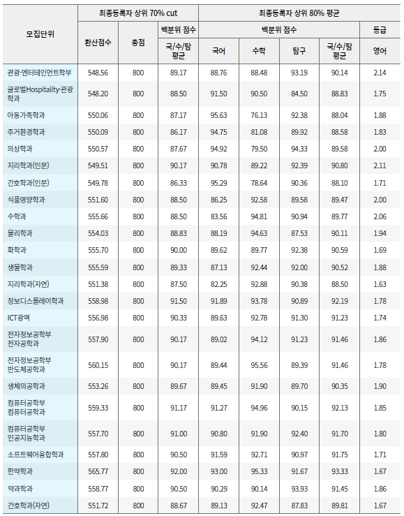 여기서도 최종등록자 상위 70% cut 기준으로 해서 백분위 점수 높은 곳을 알아보도록 하겠습니다.