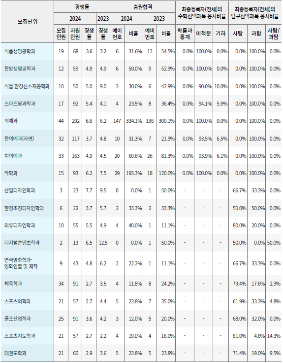 2023 경쟁률보다 높아진 학과도 있고 낮아진 학과도 있지만 전체적으로는 매년 비슷하다는 것을 알 수 있습니다.