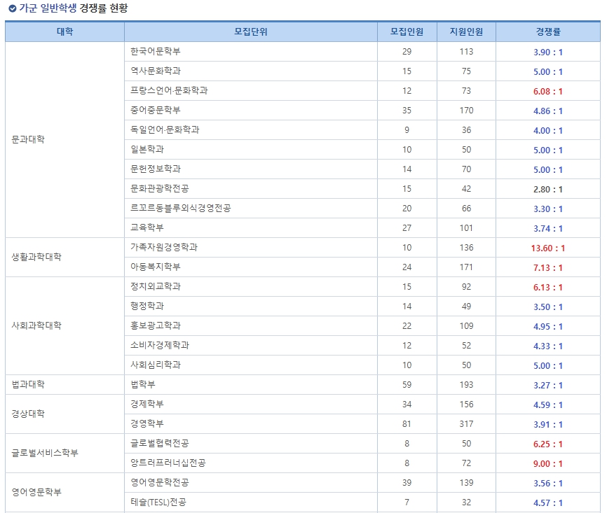 일반적으로 수능으로 대학을 가려고 하는 학생들은 가군 위주로 경쟁률을 살피고 모집요강을 살펴보는게 중요할 거 같습니다.