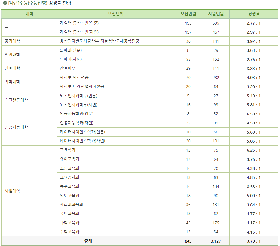 올해는 가군,나군,다군에 나눠서 분포가 되어있어서 경쟁률이 큰 의미가 없긴 하겠지만 작년에는 어땠는지 생각해보시면 좋겠습니다.