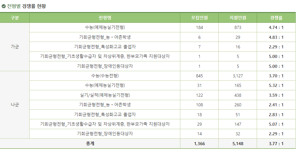 수능과 실기로 가는 예체능전형은 가군 4.74:1 / 나군 5.32:1 의 경쟁률을 보였습니다.