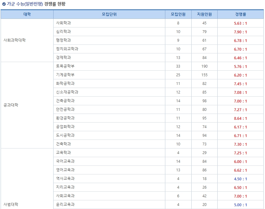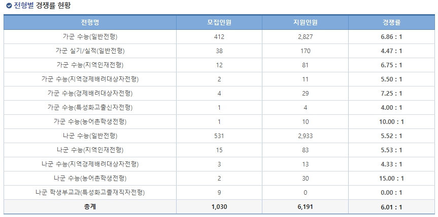 전체적인 평균 경쟁률은 6.01:1 인데 가군은 전체 평균보다 높네요.