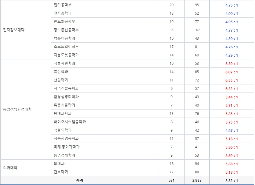 2. 2024 충북대 정시 가군 경쟁률 학과 TOP 5