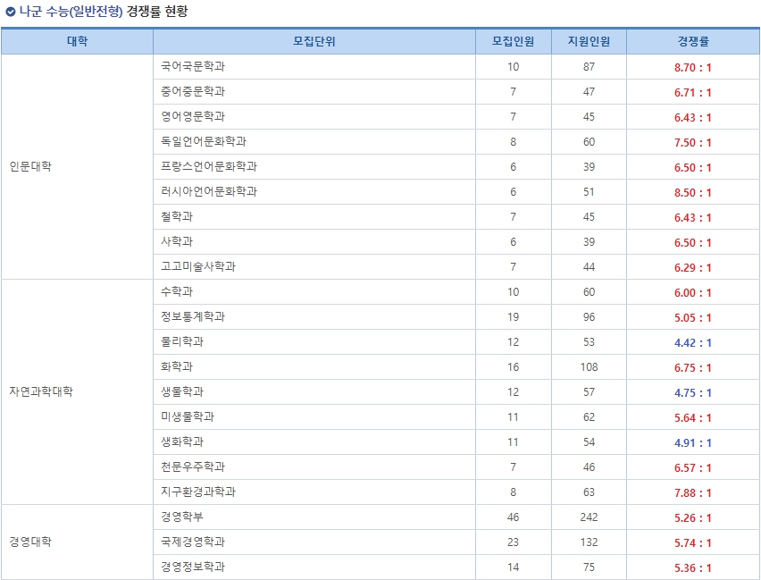 자연계열 쪽 학과의 경쟁률이 인문계열 보다 더 높습니다.