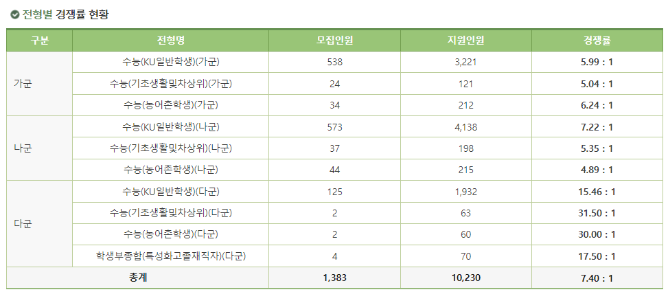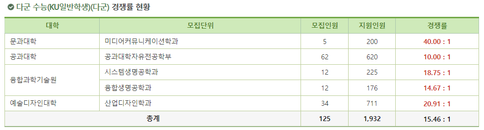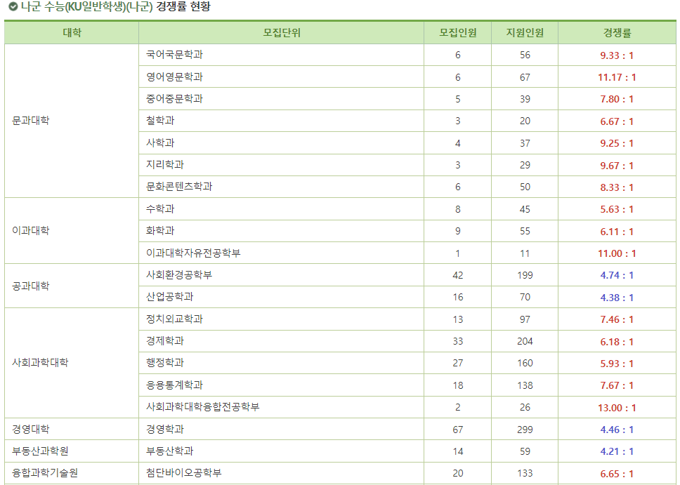 2. 2025 건국대 정시 가군 경쟁률 학과 (KU일반학생전형)