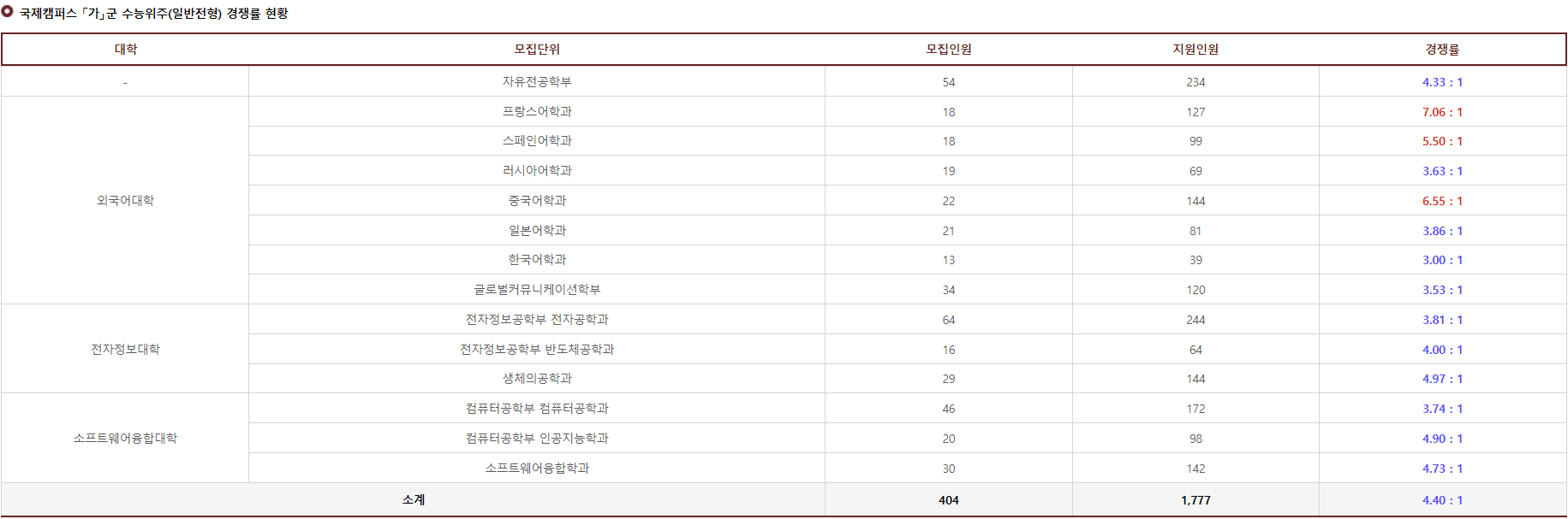 마지막으로 국제캠퍼스 나군 경쟁률을 살펴보도록 하겠습니다.