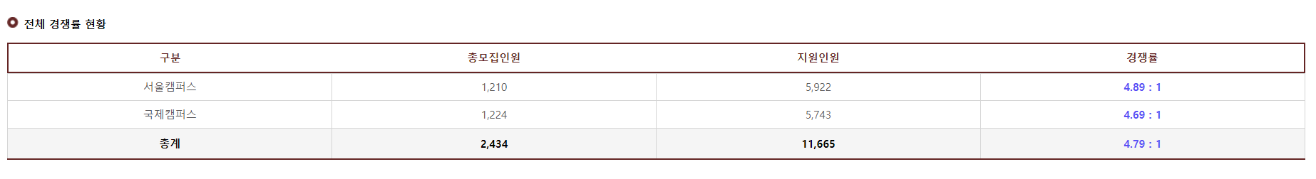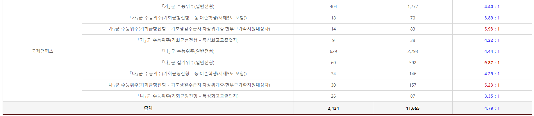 서울캠퍼스와 국제캠퍼스의 경쟁률을 보면 전형마다 경쟁률이 있습니다.