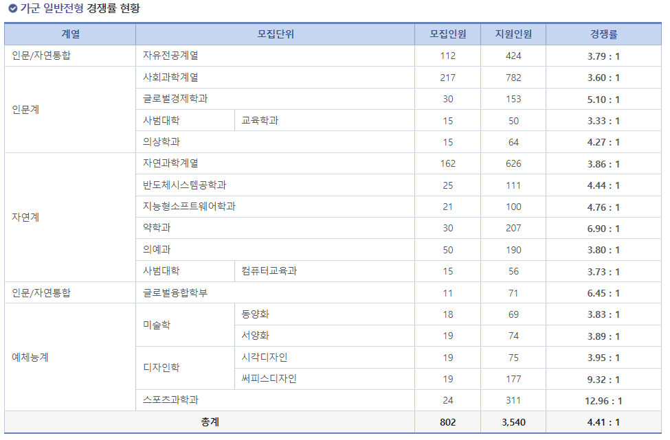 나군에는 예체능이 없이 인문계와 자연계만 있네요.