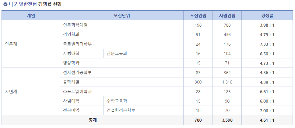 이렇게 됩니다. 가군보다 나군에 포진되어 있는 학과가 적은 것도 있지만 전체적으로 학부나 계열 쪽이 많아서 전체적인 지원은 이 쪽이 더 많네요~