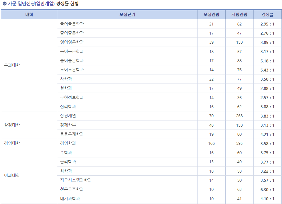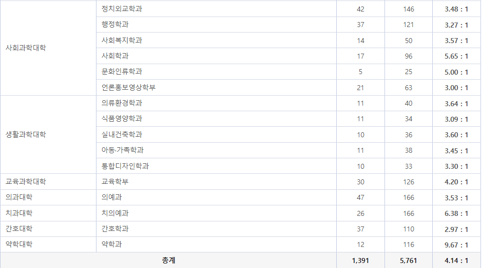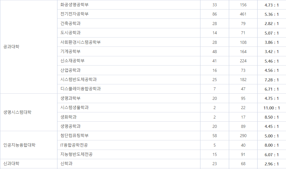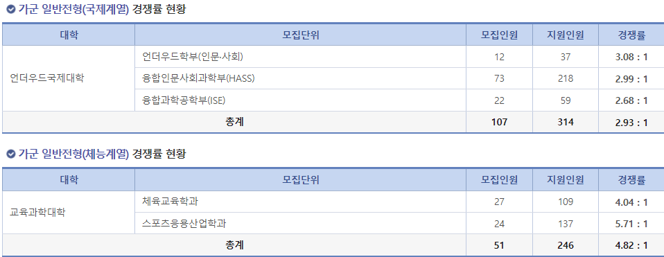 언더우드국제대학은 2.93:1 / 교육과학대학은 4.82:1 이네요.