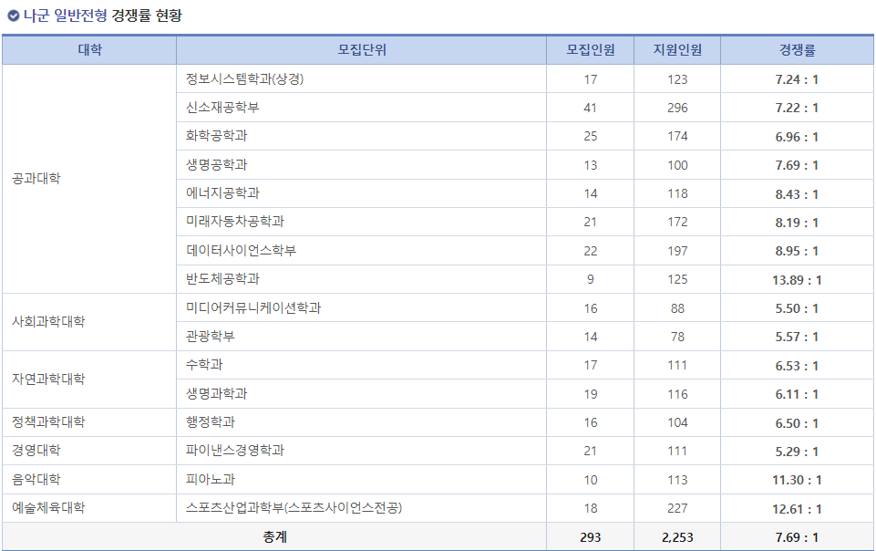 나군의 평균 경쟁률은 7.69:1 입니다.
